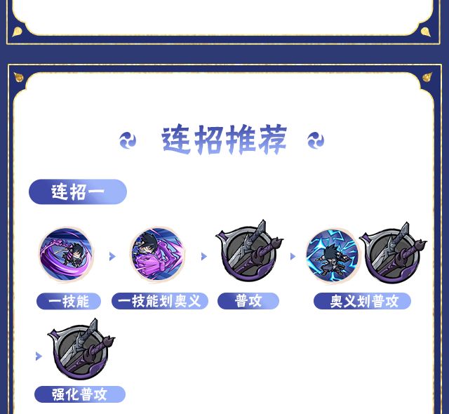 二技能摸奖起手,奥义划普攻释放双剑齐鸣进入强化状态,持续强化普攻继续输出,随后二技能划奥义使用飞鸟折白梅上挑敌人,一技能划普攻打出踏焰追云纵,再按普攻突进攻击。