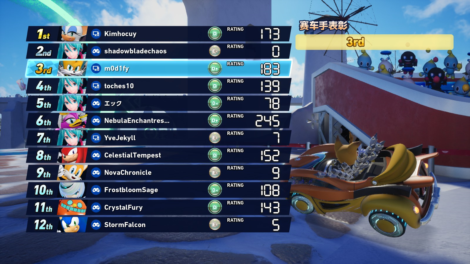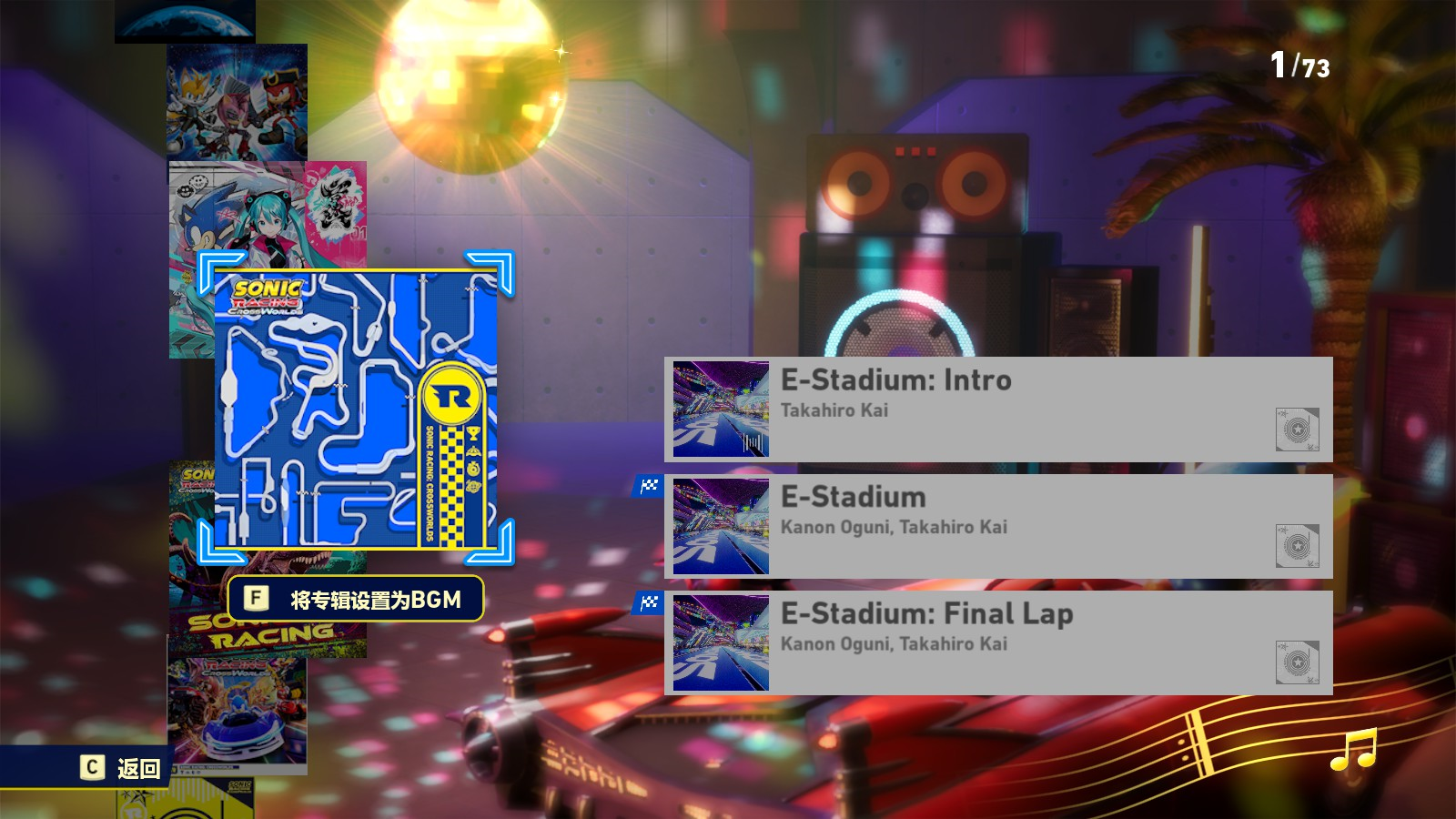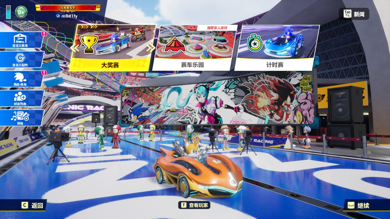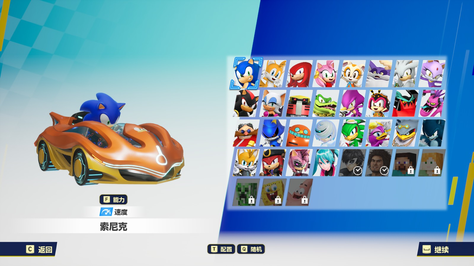 作为索尼克IP下的赛车游戏,本作加入的角色非常的多样,除了出现在索尼克IP宇宙中的各式各样的角色之外,还加入了很多SEGA旗下许多其他IP的经典角色,例如在初音游戏中的初音未来、女神异闻录中的joker、如龙里的春日一番,甚至还有我的世界中的方块人,以及动画片里的海绵宝宝和派大星。除了游戏本身,制作组还为玩家提供了丰富的收集要素以及成就解锁系统。此外,玩家还可以在音乐台选项中欣赏游戏收录的诸多音乐,并且可以将玩家喜欢的音乐设置成比赛时的BGM。