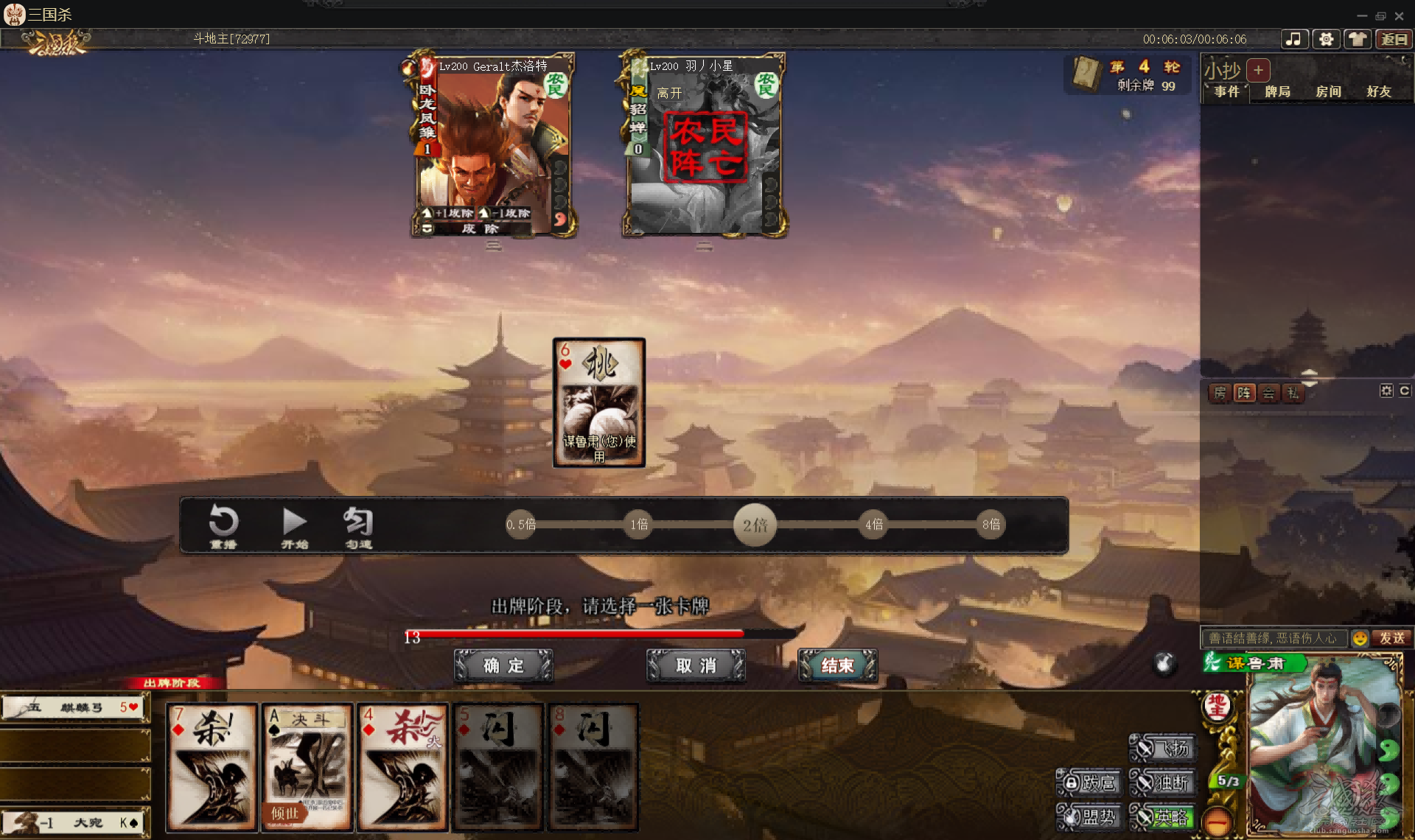 于是貂蝉入魔找伤害同时加快自己死亡,第三轮龙凤成功收掉貂蝉,但这个状态的龙凤显然无法和地主鲁肃抗衡,最终投降。
