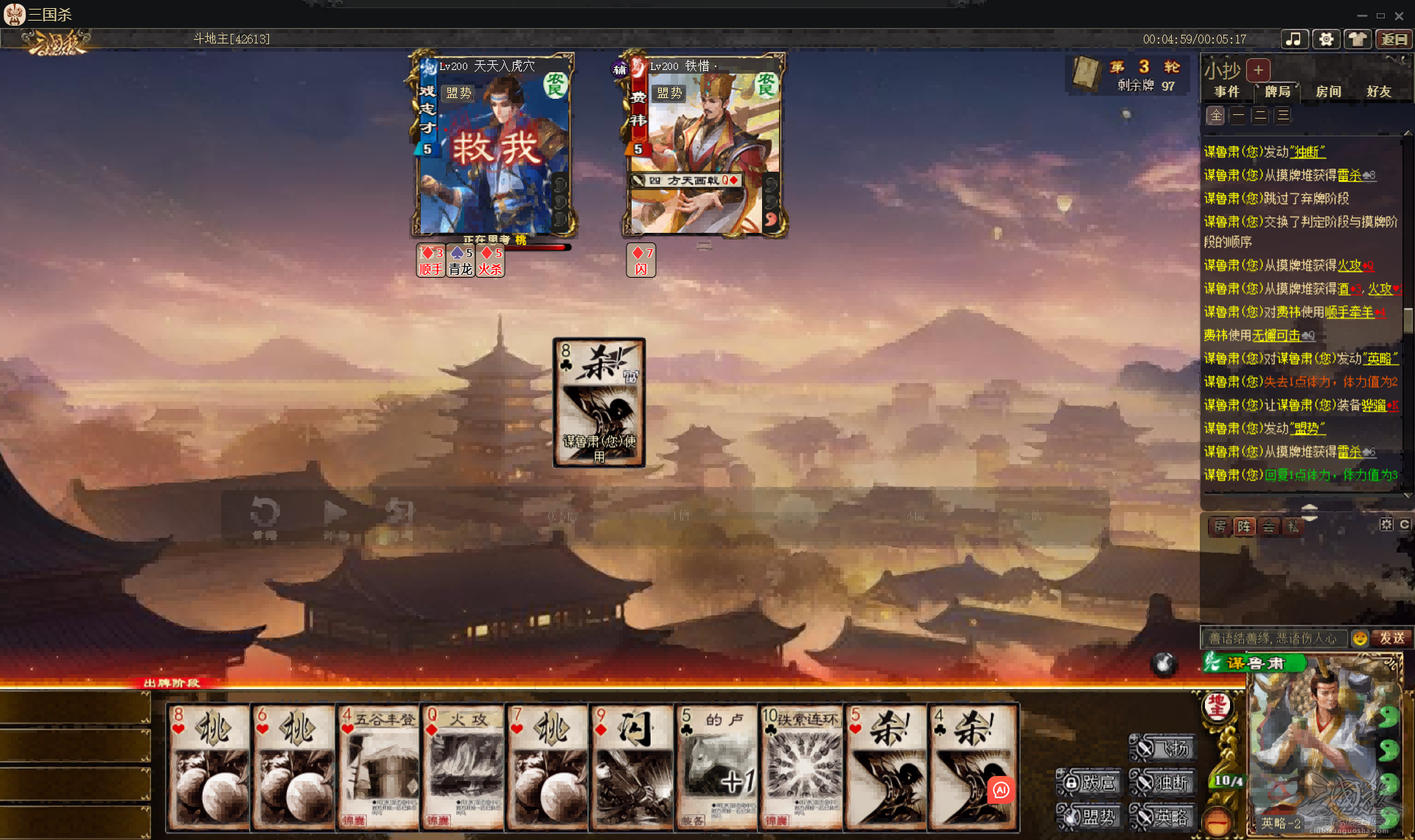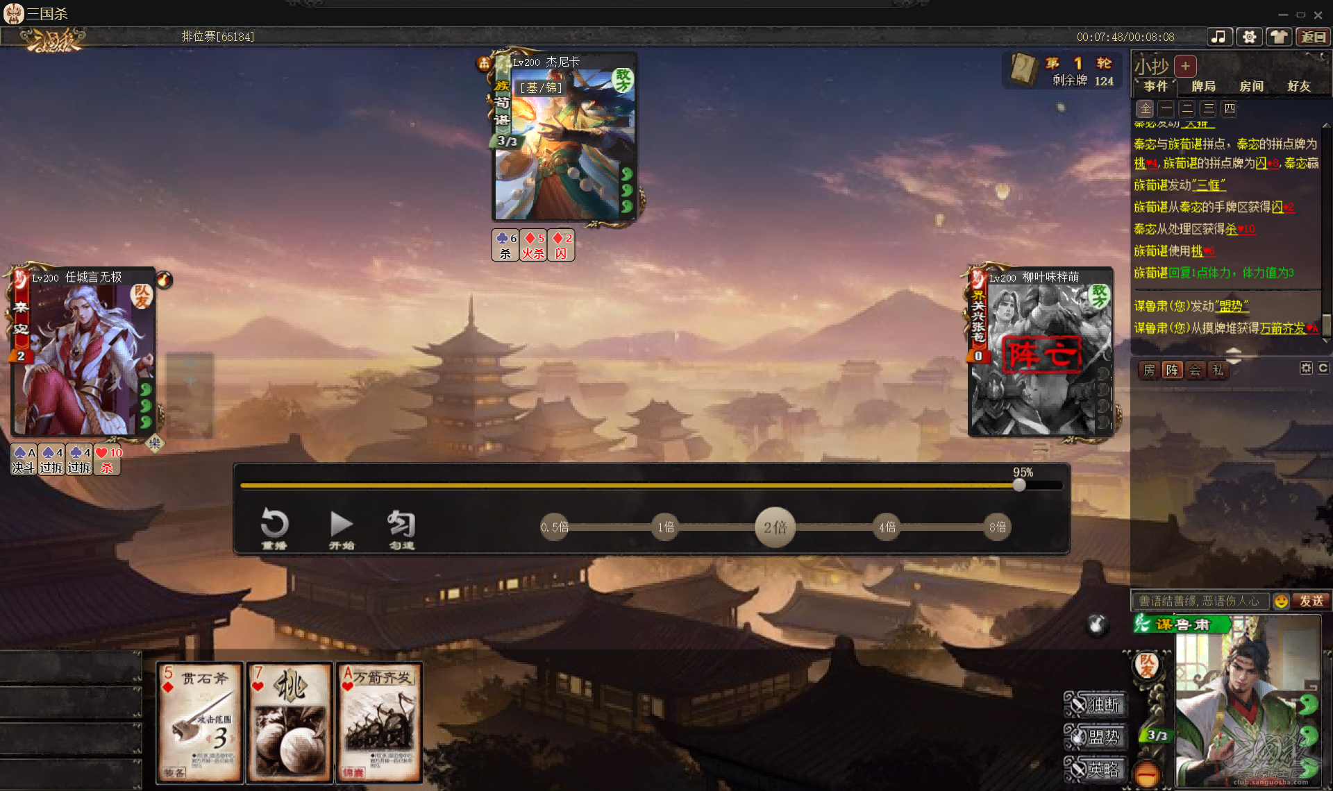 很显然,由于之前的分析,主技能【盟势】对谋鲁肃自身的血量有一定的要求,但谋鲁肃本身三血无防,这样的身板作为农民显然是很难有好的状态开出大招的。而谋鲁肃作为地主则有极高的坦度,同时左右开弓集火强单挑武将的打法也让农民颇为为难,消耗大量资源去收掉队友会让先和状态极佳的鲁肃地主进行单挑,而两个农民如果都活着,想要冲死谋鲁肃的难度显然极大,这一点可以类比当年的曹宪曹华,不过显然,在坦度方面鲁肃远胜于二曹。这里给出两个实战对局分析: