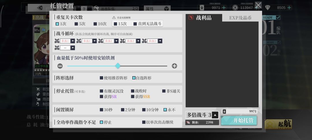 一般来说,航母战斗力强,出战位即可,后排可以带个奶补血,避免血量低导致boss关a胜,不方心的话也可以把使用安铂铁剂设置为血量低于50%。