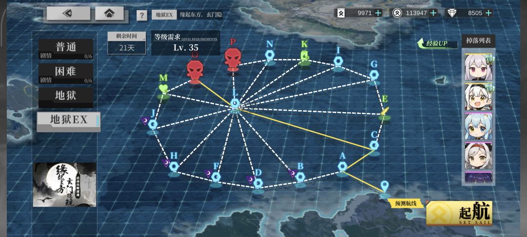 顺时针走的话,“筛孔”是舰队的船数,走到哪一点,当舰队船数符合该点转中心点的要求就去到中心点l,之后如果旗舰有轻巡就去o点捞重庆,没有轻巡就去p点捞逸仙。如果一直没有走到符合的去中心点的筛孔,就会一直去到o点。