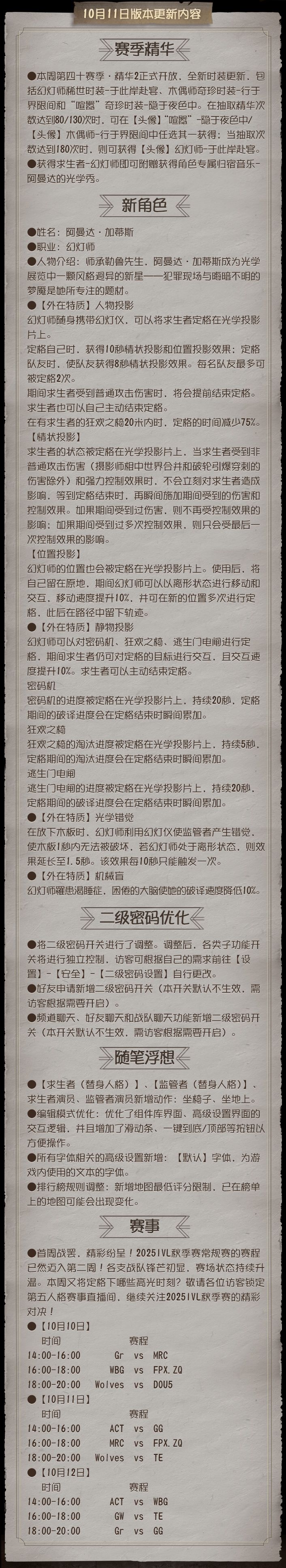 ——【赛季精华】 :本周第四十赛季·精华2正式开放,全新时装更新,包括幻灯师稀世时装-于此岸赴宴、木偶师奇珍时装-行于界限间和“喧嚣”奇珍时装-隐于夜色中; ——【新角色】 :新求生者-阿曼达·加蒂斯-幻灯师上线; ——【二级密码优化】 :将二级密码开关进行了调整。调整后,各类子功能开关将进行独立控制,访客可根据自己的需求前往【设置】-【安全】-【二级密码设置】自行更改。 ——【随笔浮想】: 编辑模式优化、新增默认字体、排行榜规则调整。 更多详情,请看长图了解~