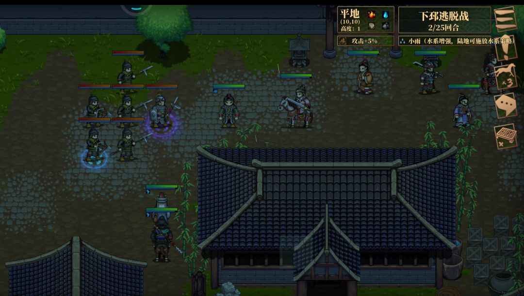 过关攻略1:这关操作复杂一点,吕布三号位,开局五号位给吕布一个强行,吕布跑到②位置;二回合吕布跑到③位置,这样可以不触发⑤位置的伏兵。三四回合吕布再往左移一移,开疾驰,最迟六回合④号位置战斗结束了,吕布跑到大门口过关。