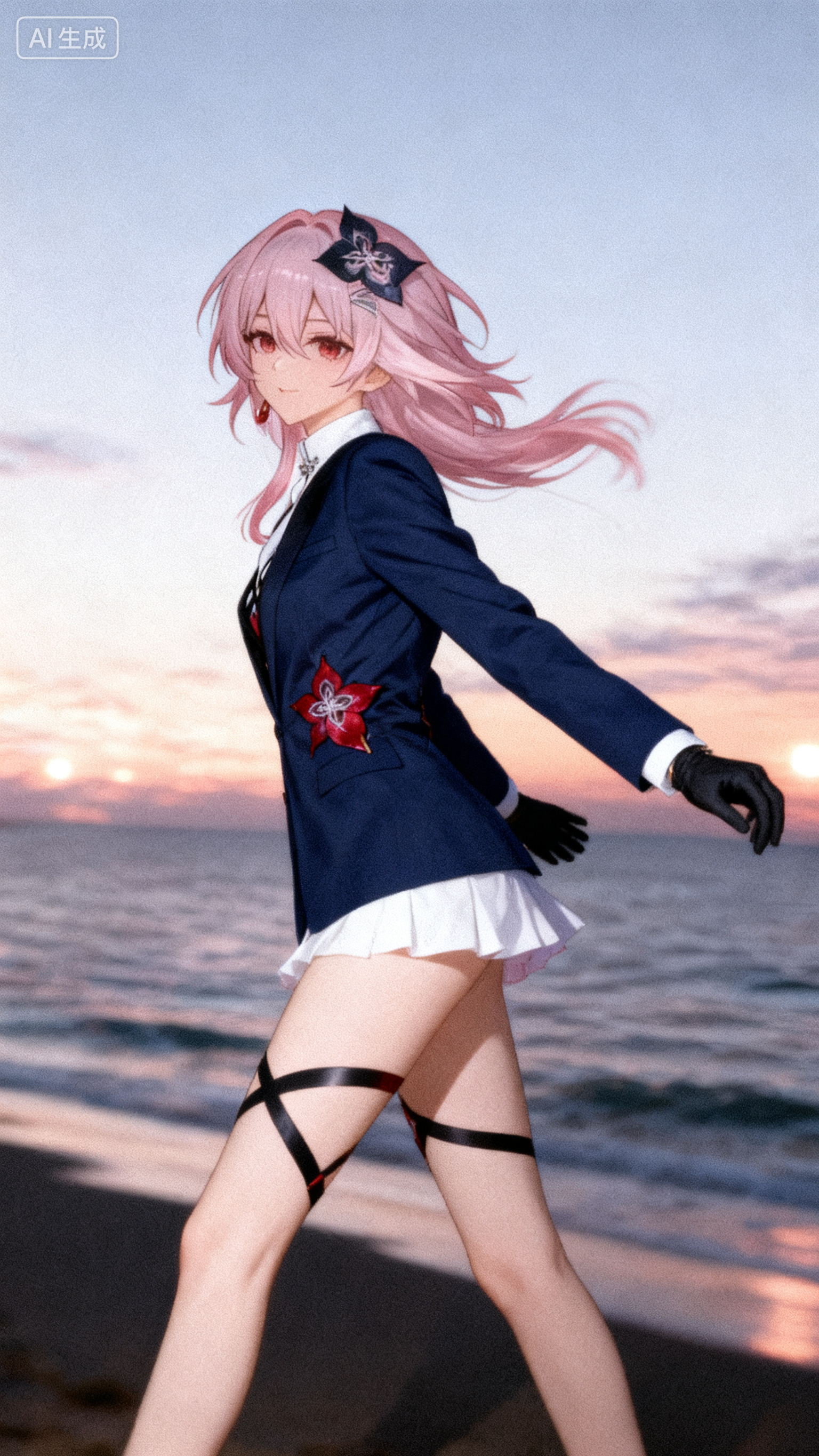 anime-style beautiful female character with long pink hair and red eyes, holding a red umbrella, wearing black gloves and unique floral-themed thigh accessories, dressed in a black and white outfit with red accents, sitting gracefully on a stone platform against a dark star-lit sky with soft lighting from the right, creating an alluring and mysterious atmosphere, color palette dominated by pink, black, white, and red.n #崩坏星穹铁道 #于长夜重返大地打卡