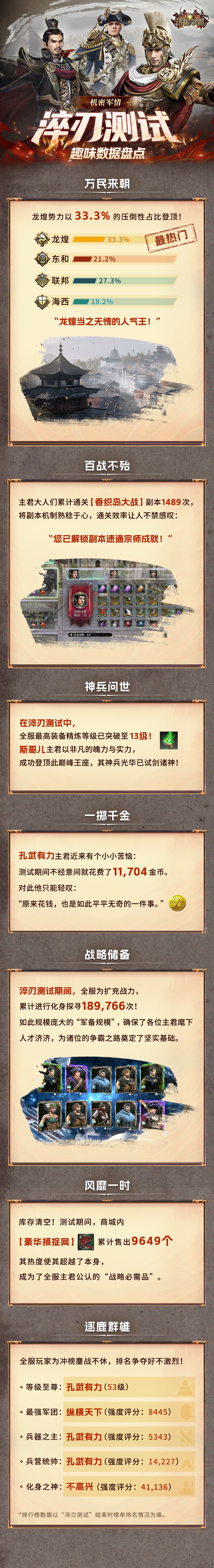 沙场终有尽时,但诸位主君在刀光剑影中缔造的传奇,我们已悉数铭刻。究竟哪个势力参与人数最多,凝聚为战场洪流?又是哪位统帅在群雄逐鹿中登顶称王……这份以热血写就的战报,便是记录这一切的丰碑。