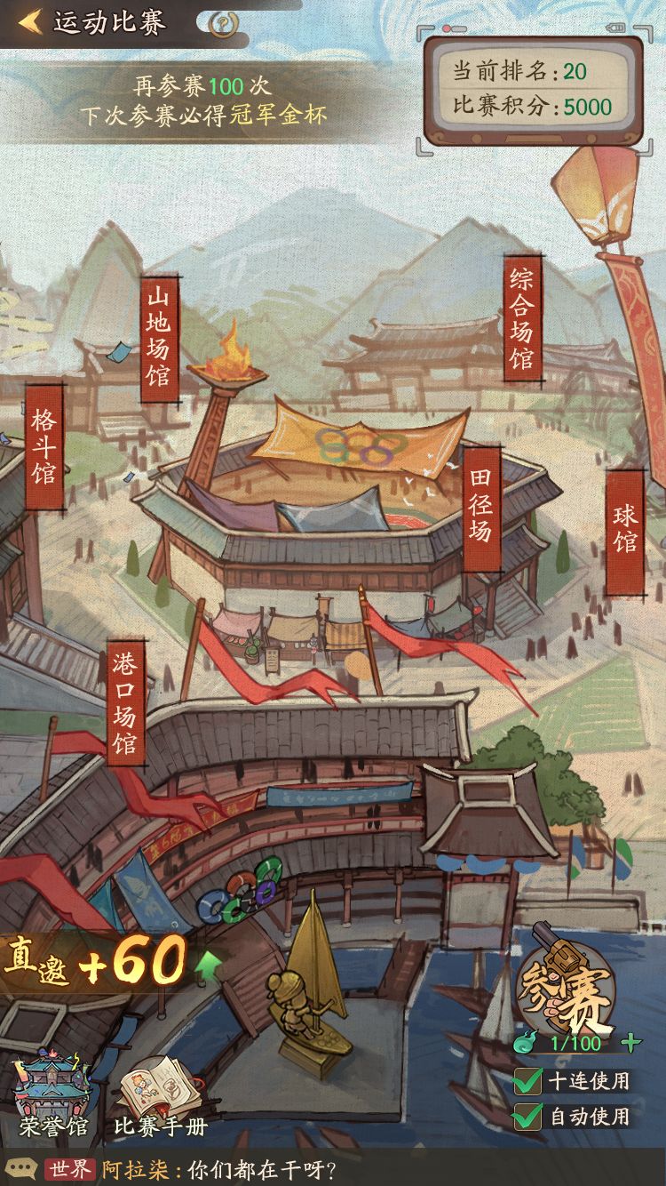 活动开启后,掌柜可前往运动会场,消耗「参赛券」参与比赛,会场内含有6个场馆,每个场馆内含有6个比赛项目。
