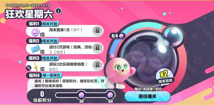 蛋仔们周末登录可直接领取2枚彩虹币,总积分数下调至60,攒取进度仅需4彩虹币,减负就在当下,愉快领取免费彩虹币~