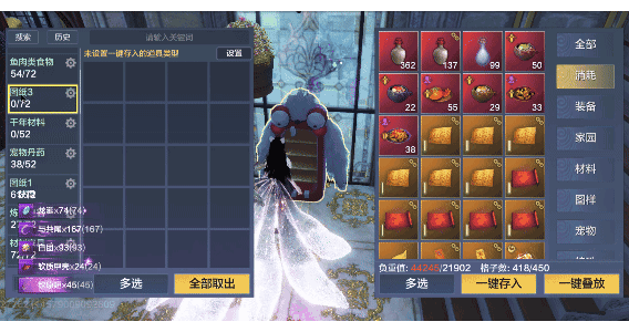 一键存入所有仓库:即按仓库的默认排序,优先按照仓库设置,找到可以堆叠的道具进行堆叠,再将其他道具存到仓库里