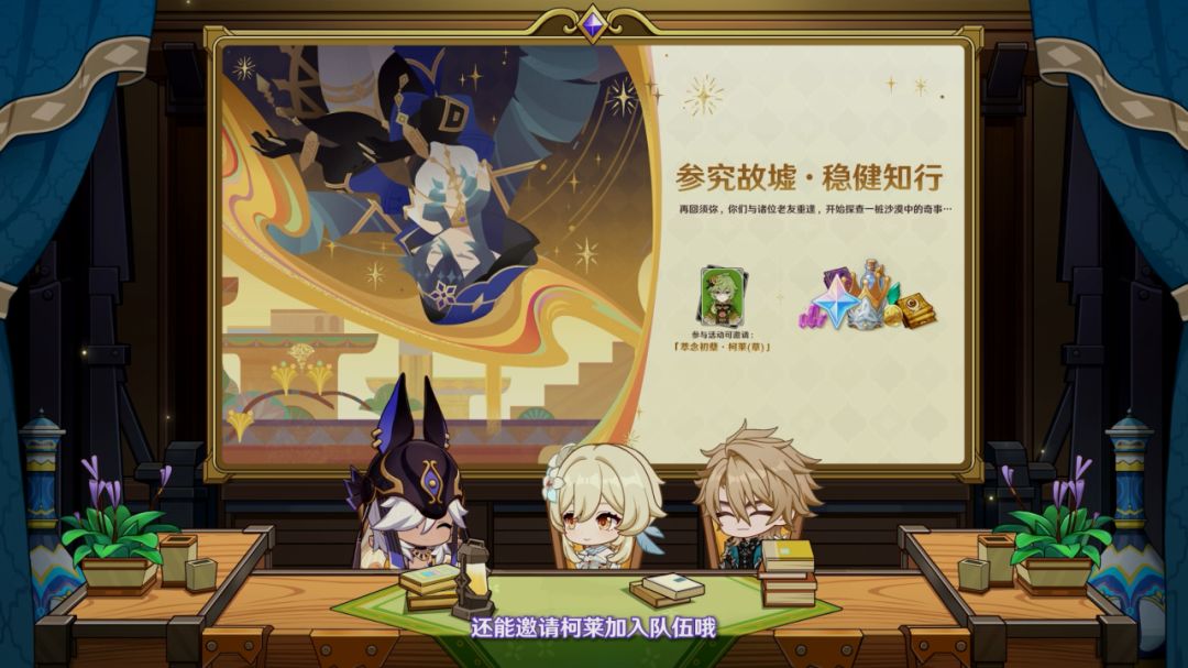 版本大活动的舞台在须弥,共有3个小玩法(跑酷、机关移动、战斗)。参与版本大活动,我们可以获得柯莱。