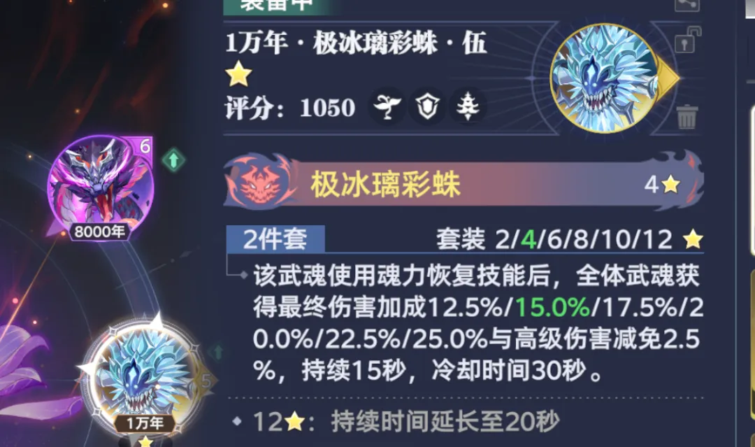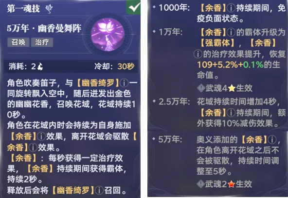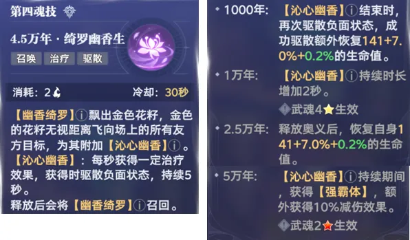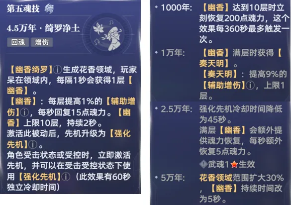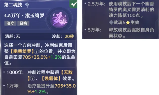 接着则是第6魂技,这个技能和2魂技相反,则是立刻会回到幽香绮罗周边,并且可以免疫对方的控制技能,PVE基础5秒,PVP则是基础2秒持续时间,此外这个技能还有小幅输出+驱散+使下一次能量消耗减100点等能力,这些和2魂技都比较类似,不过在提升到红色2星后,6魂技还能额外获得2层3被动的“芳迹”状态或是5被动的“幽香”状态,并且还有持续5秒的强霸体效果。所以考虑到2魂技的直接回血效果和6魂技的免控效果,无疑2魂技会相对更适合PVE副本,6魂技则会相对更适合PVP副本,当然这也不是绝对的,大家需要根据自身的客观情况来做取舍。