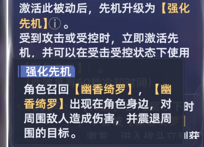 此外3被动还有一个可以激活“强化先机”的效果,那么通过实测这个先机例如在常规先机被触发后,我们立马受到攻击也是可以通过切换到叶原来触发的,触发后可以震退身边的敌人和召回幽香绮罗,而这个强化先机的触发时机一是大家受到伤害,二是如下图所示叶原的图标会显示一个较为特殊的浅紫色光芒,此时便可以通过切换到叶原来触发强化先机了。