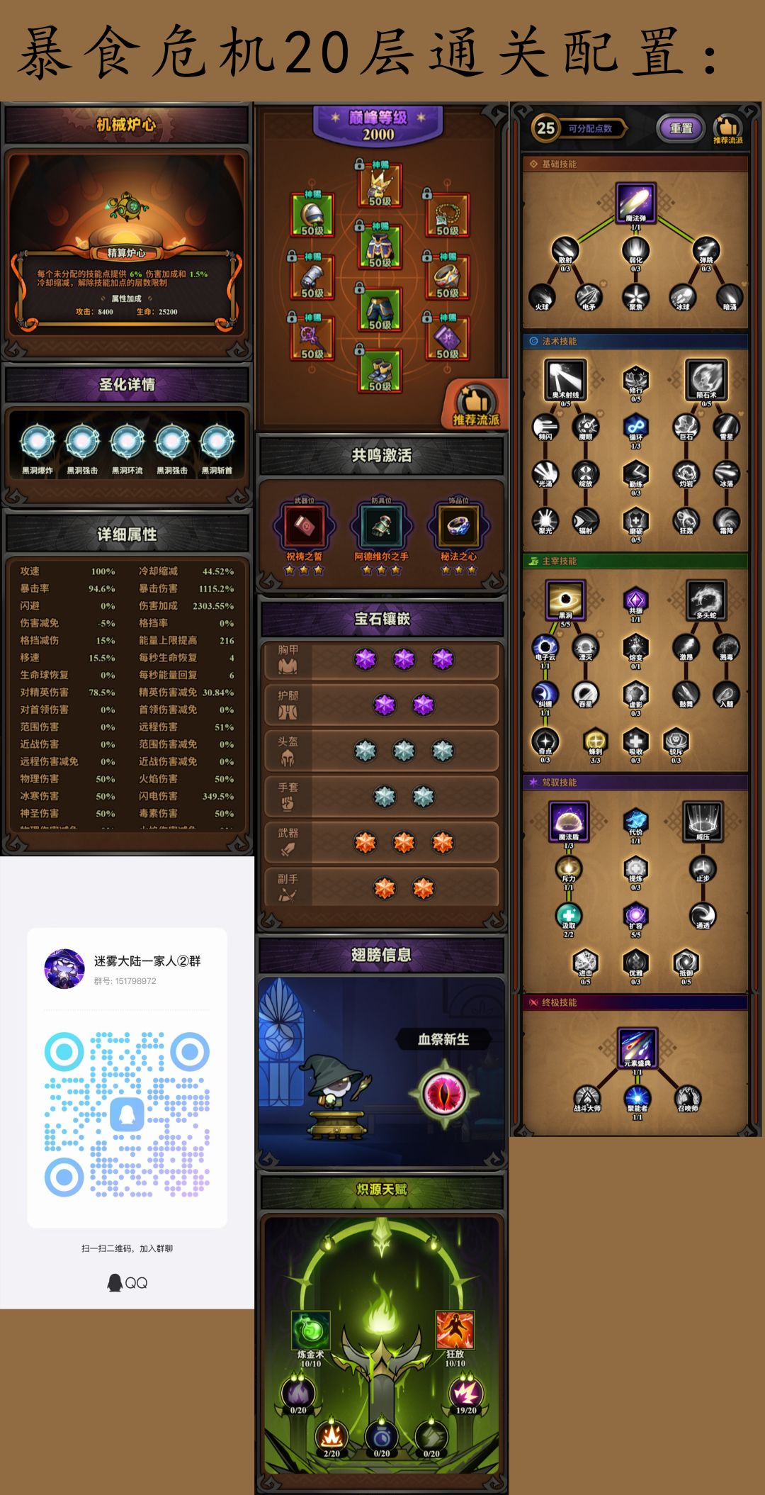 为什么今天才通关,因为没氪炽源材料,昨天才两个10级,炽源没满级的情况下暴食危机20层就不用想了。再说一下炽源天赋等级要求,霜烬至少10炼金6狂放,暴食危机要求两个技能都要满级。其实霜烬回廊通关靠的不是伤害,伤害差一点无所谓,最重要的是赌怪和赌爆炸。暴食危机就是纯靠伤害数值通关,两个天赋满级的情况下暴食用我这套配置多打几次就能通关了。有问题可以下方留言我会一一解答,欢迎加入交流群讨论游戏。