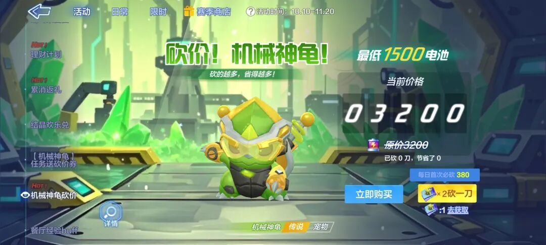 打破常理的机械力量 ,强化辅助与防御之力,更有针对性的黄金实力。10月10日,机械神龟砍价活动开启,参与任务即可参与优惠砍价,最低1500电池即可拿下全新传说宠物【机械神龟】!