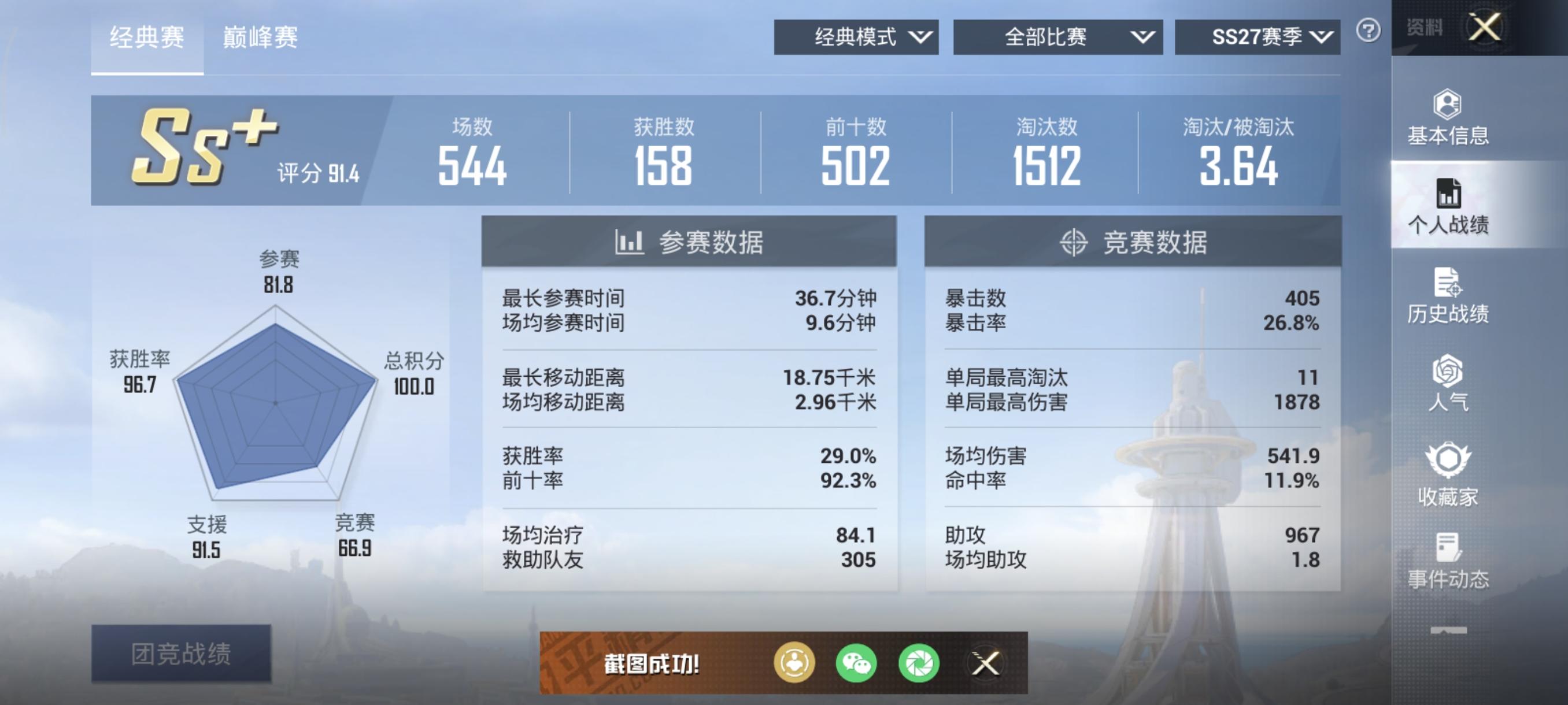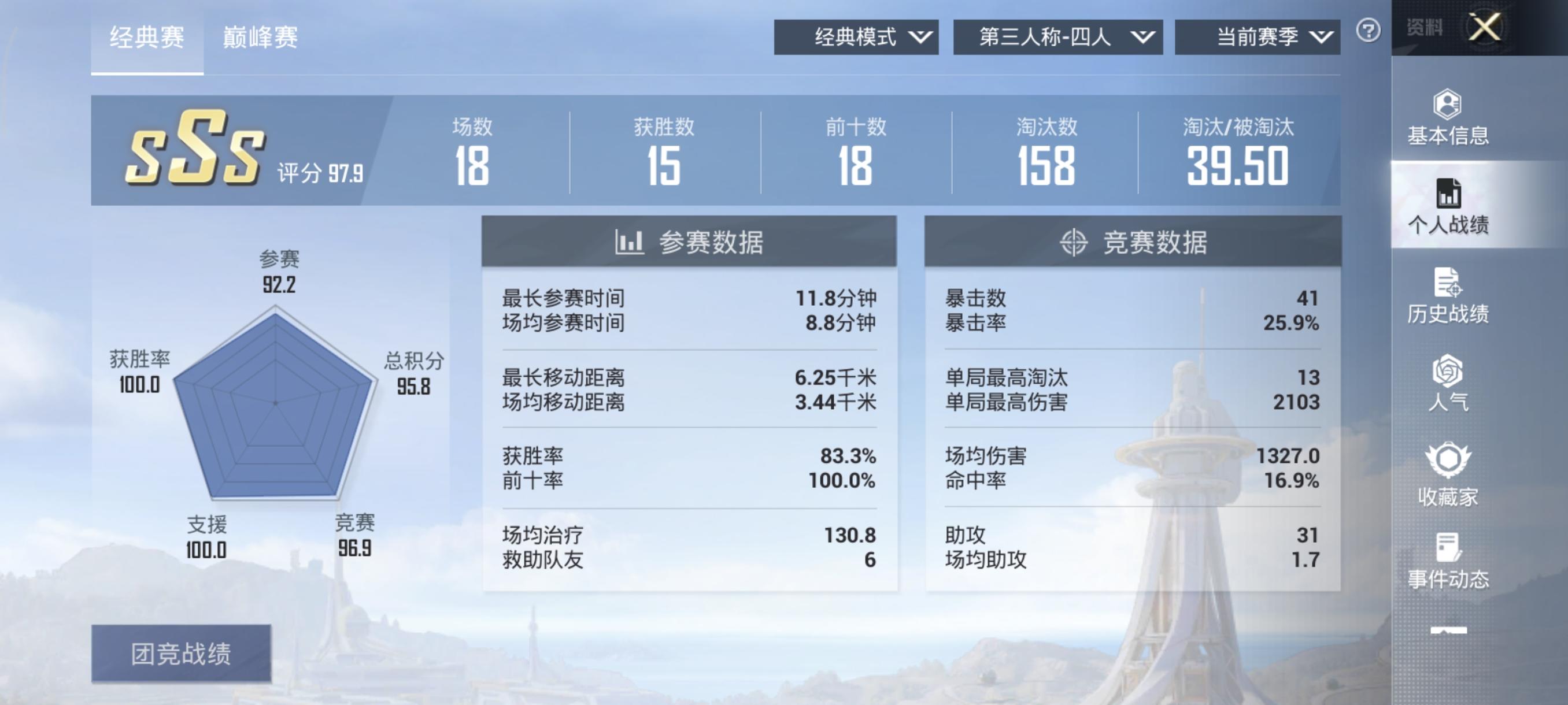经典模式,一局有30分钟,他打了19局,有15局吃鸡,但是最长参赛时间是11分钟,也就是这十五局吃鸡的里面都是10分钟左右把全图的人杀完了