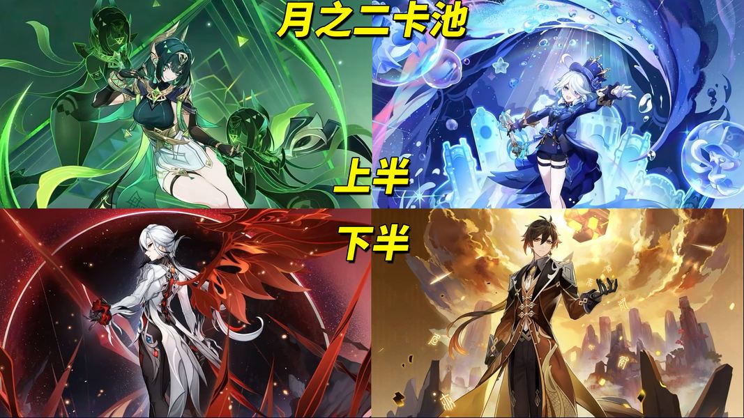 ①上半:奈芙尔(真语秘匣)、芙宁娜(静水流涌之辉);②下半:仆人(赤月之形)、钟离(贯虹之槊)。