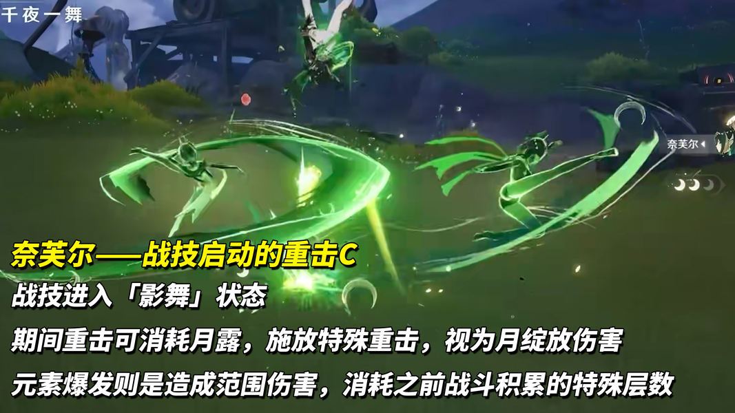 【奈芙尔——5星草元素法器】战技启动的重击C。施放战技进入「影舞」状态,在此期间长按普攻,可消耗“草露”施放不消耗体力且视为月绽放伤害的重击;元素爆发则是造成范围伤害。