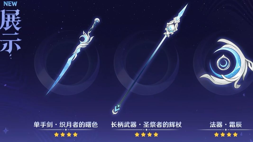 【新4星武器】织月者的曙色、圣祭者的辉杖、霜辰,这三把武器会在当前版本出现在卡池UP中,应该算是挪德卡莱的限定4星了,其中织月者的曙色在剧情中已获得1把,抽到后可继续精炼。
