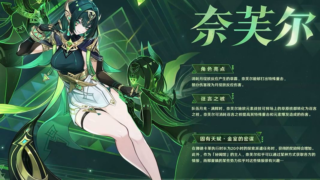 天赋效果:可执行更长时间的探索;月兆+1,并将队伍绽放反应变为月绽放,应该是菈乌玛同款天赋了;草原核变为诳言之核,只可被奈芙尔重击吸收用于提升重击与大招伤害。