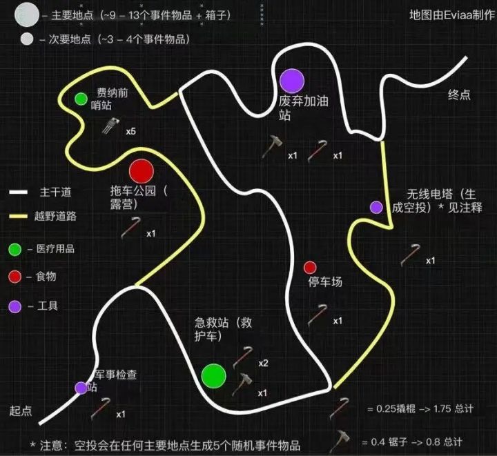 注意:若空投刷出食物补给(最烂的),由于营地给的食物较少,则可能需要额外刷食物小地点,一次停车场为3食物。