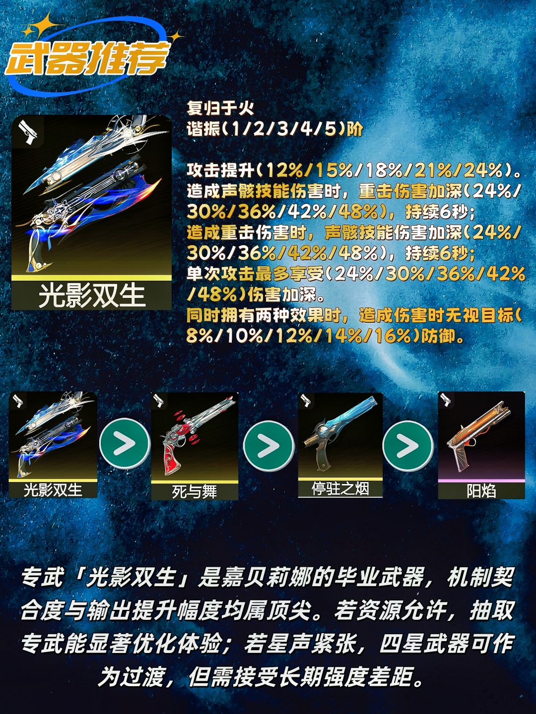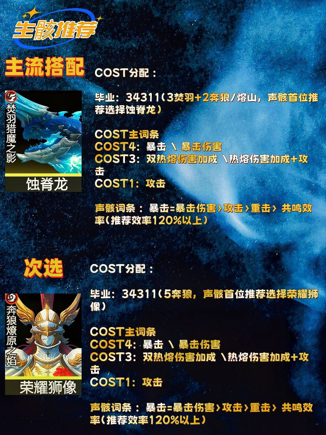 - 副词条:优先级为暴击率=暴击伤害>攻击百分比>共鸣效率>攻击力。