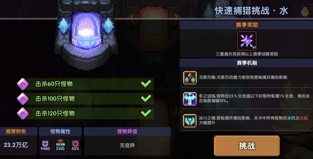 冬之试炼:怪物在25%生命值以下时,每秒恢复1%生命,角色攻强增幅增加10%