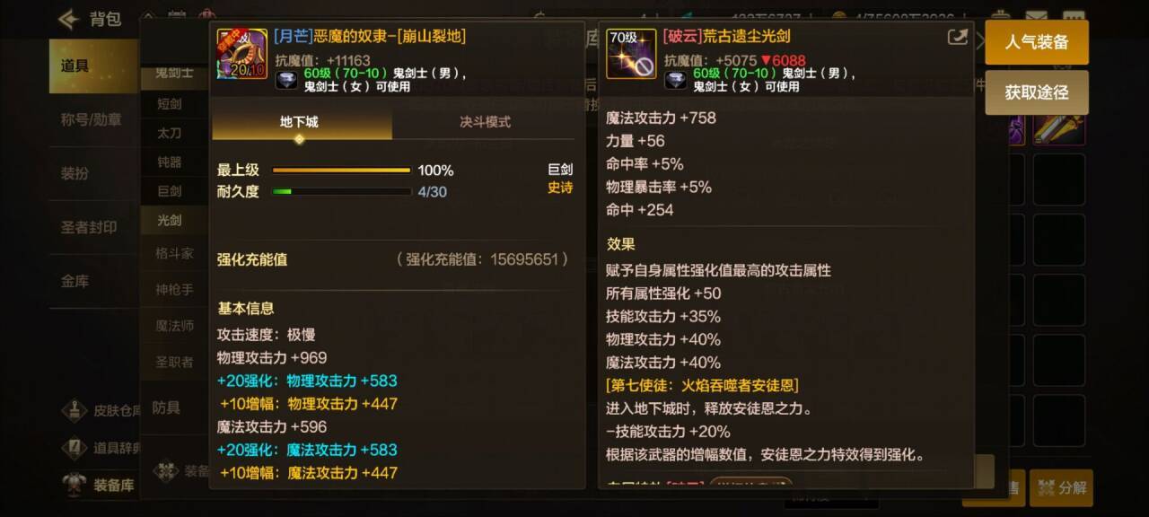 (2)唯独剑豪出了荒古武器,闯进前三!如果小编没有记错的话,这么久以来剑豪从来没有上过前三,甚至是前五的行列,本次的剑豪大佬也算是扬眉吐气了一把,虽然是榜单中唯一一个配置了荒古武器的大神,对比70级武器而言多出了20%的技攻效果,但运气本身也是实力的一部分;也祝愿全部勇士能够早日出荒古武器;