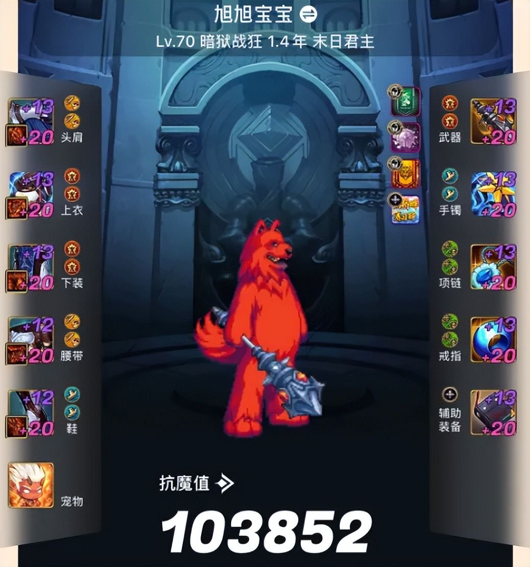 目前还剩下3个部位的贴膜没有升级到史诗,不过也就是时间问题而已了,完美状态下估计可以达到10.4万以上的抗魔值!