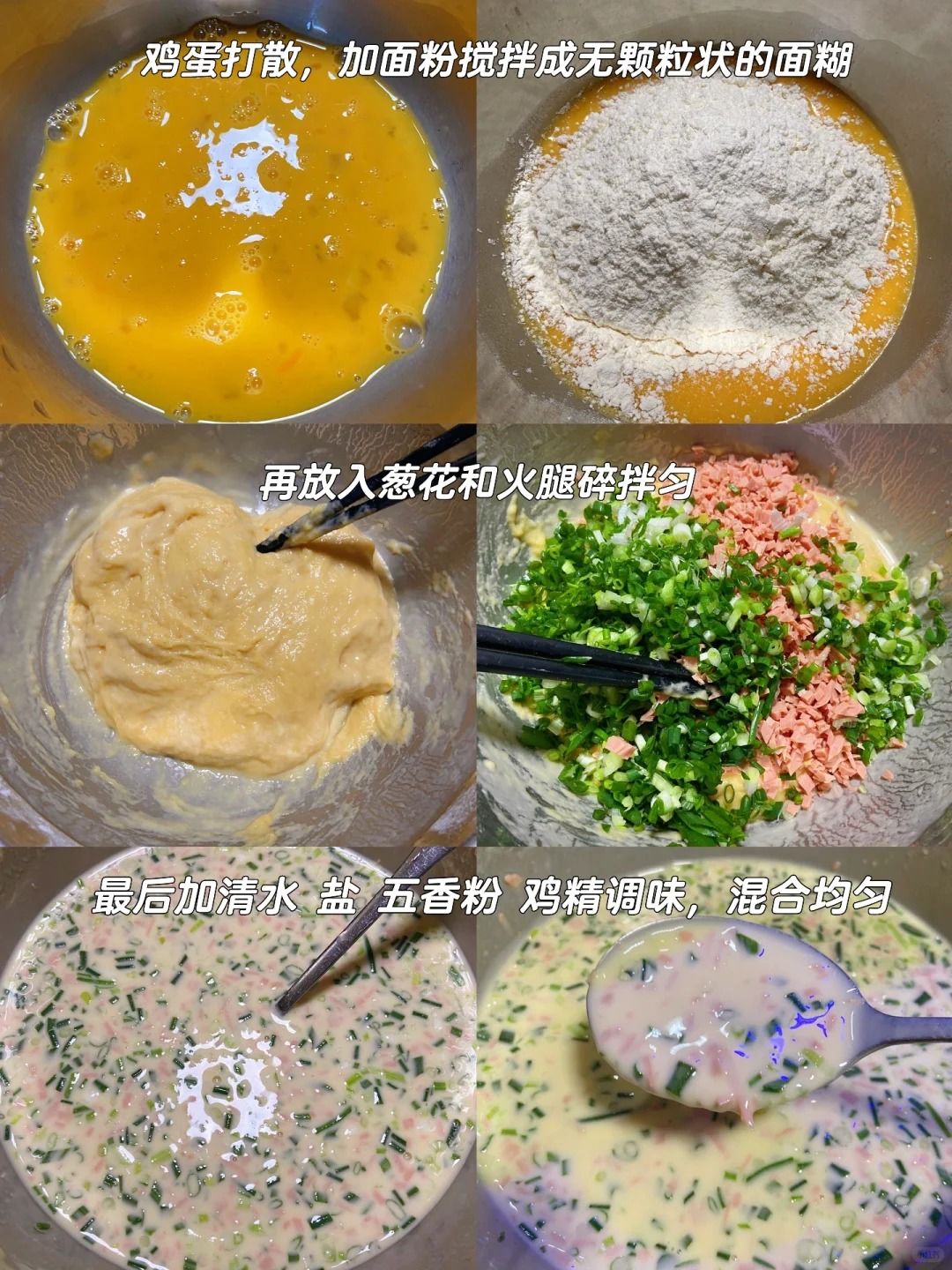 2. 先把面粉和鸡蛋搅拌成糊糊,再加入火腿碎和葱花搅匀,最后倒入清水,加盐和鸡精五香粉调味。