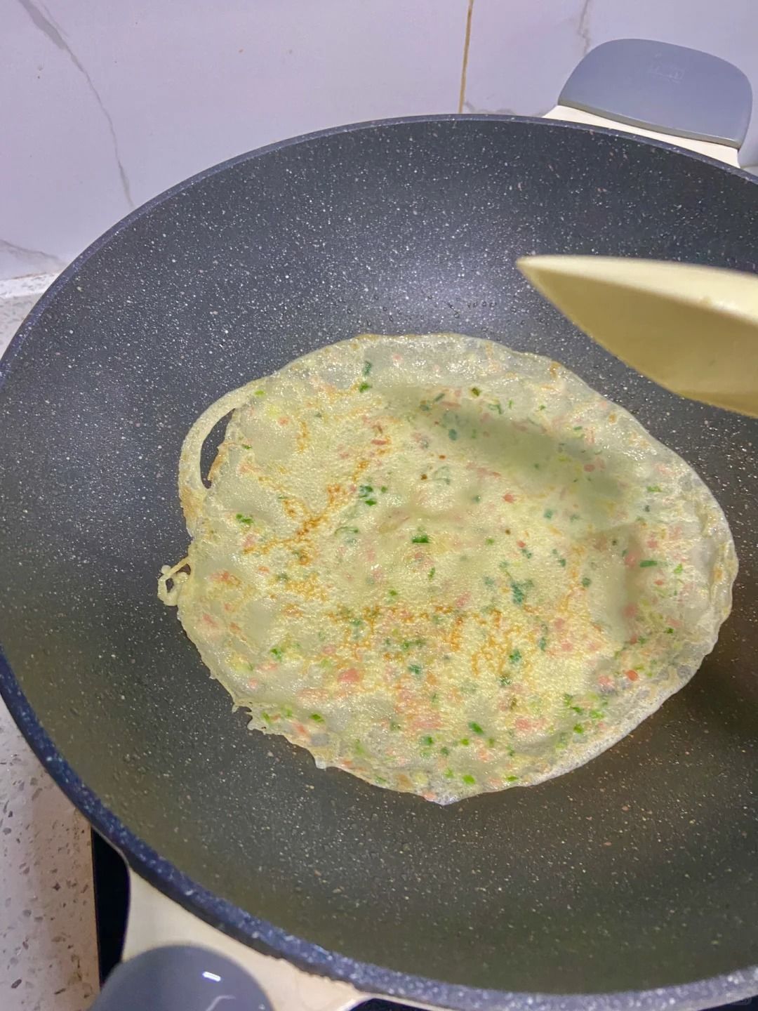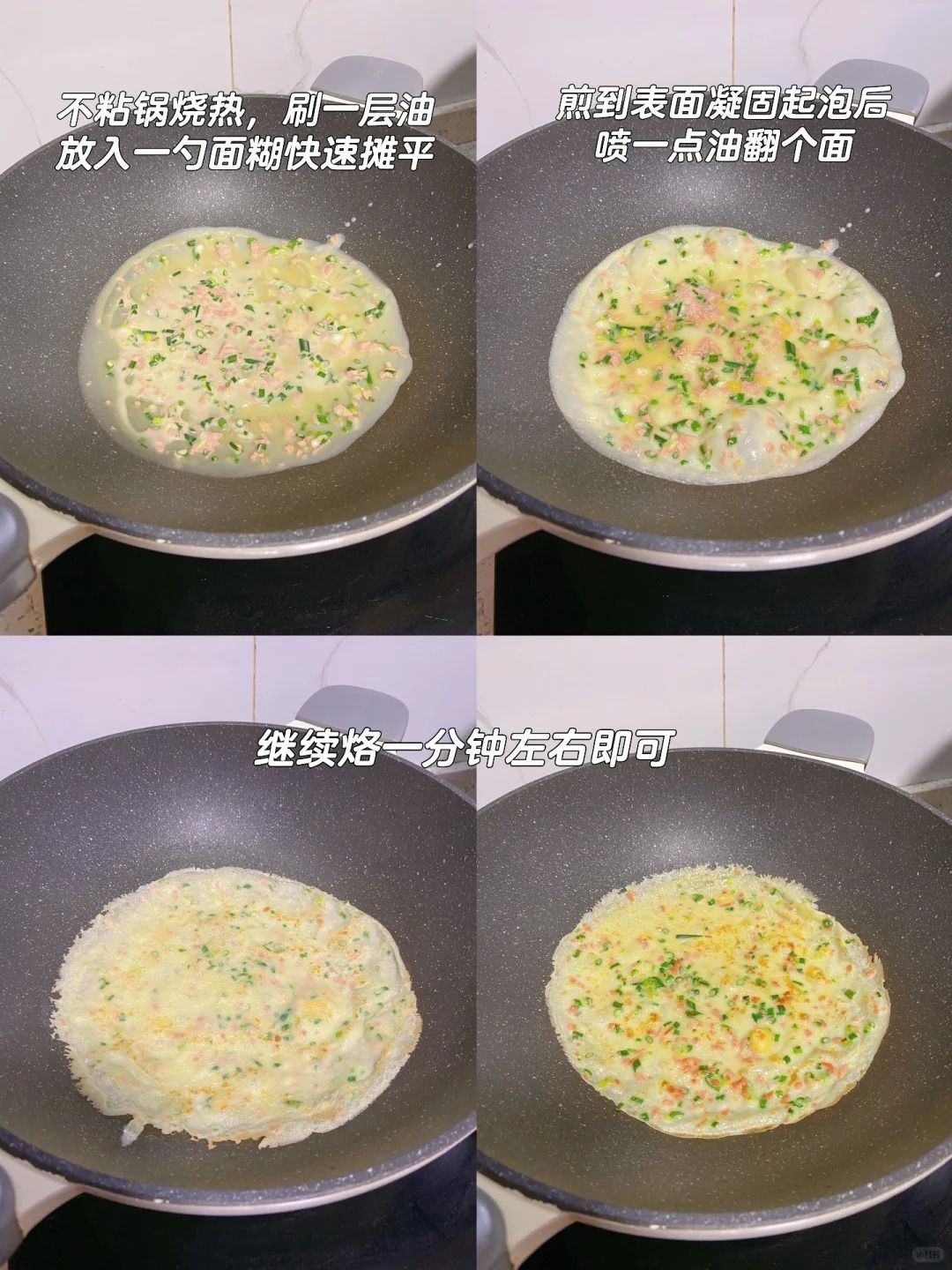 3. 平底锅加热刷一层油,倒入面糊后马上转动锅摊平,等表面凝固起泡边缘微微起焦后翻面继续煎一分钟即可。