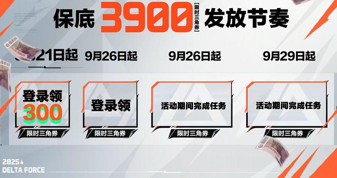 限时三角券:分阶段完成日常任务保底得3900 券,可用于抽取武器皮肤,部分活动还能解锁额外抽奖机会。