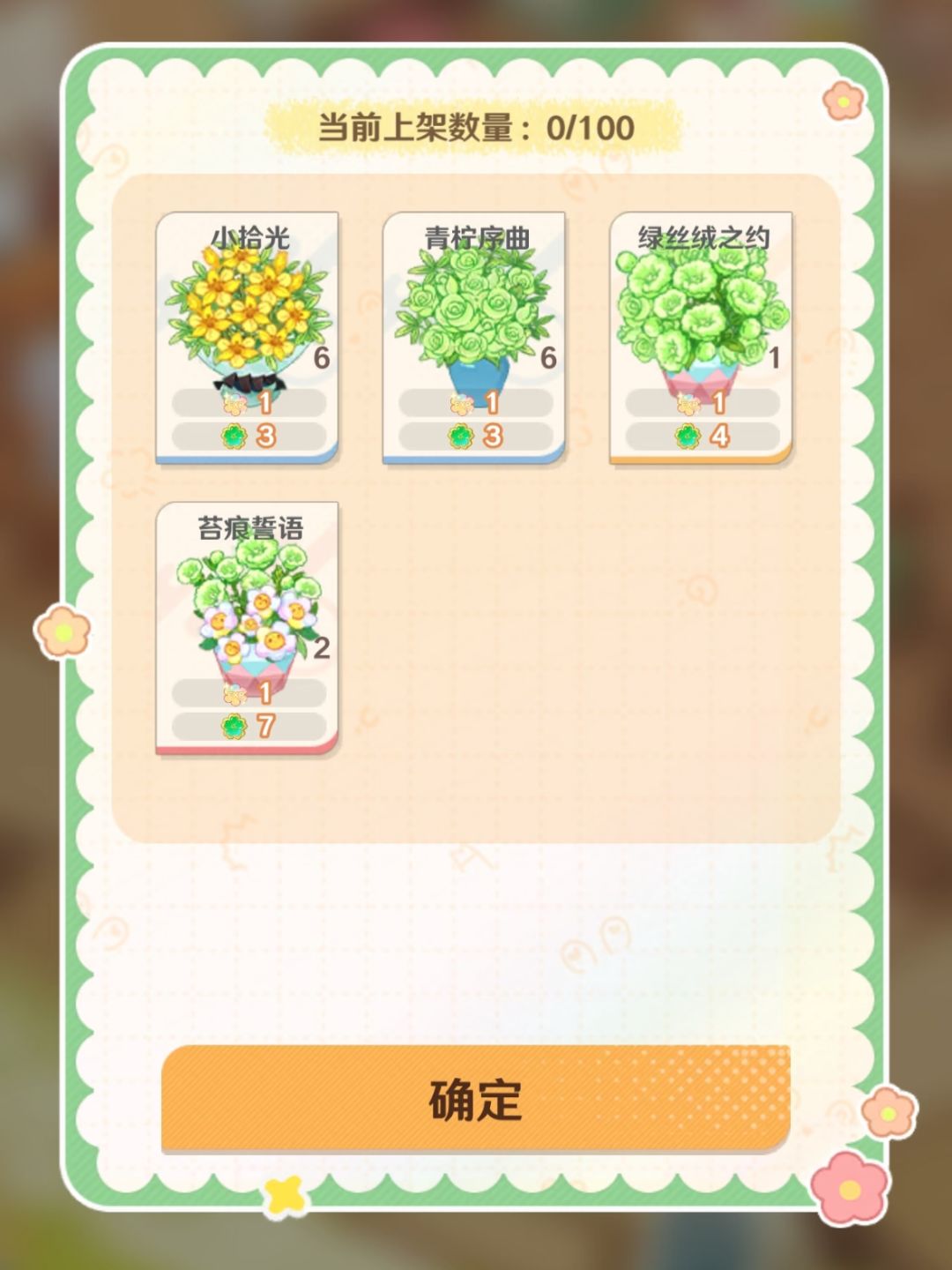 花艺品优先用于花艺订单和特殊客人,当天订单和特殊客人接待完成后,背包内每种花艺品至少保留10个,多余10个的部分可以上架销售(由于时间太短对小芽的出现模式尚不确定,此处只做参考有待修正)详见最下
