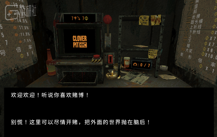 一间只够转身的狭小牢房,它大门紧锁,锈迹斑斑,灯光昏暗。房间里放置了一台老虎机,一部电话,一个供玩家购买道具的柜台,一台ATM,这就是近期走红的肉鸽“赌博”游戏《四叶草深渊》(CloverPit)的场景全貌。