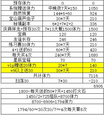 根据上表格一天购買8次体力即可~ 有些人今天刷了150 所以预存体力就没有算上去了~