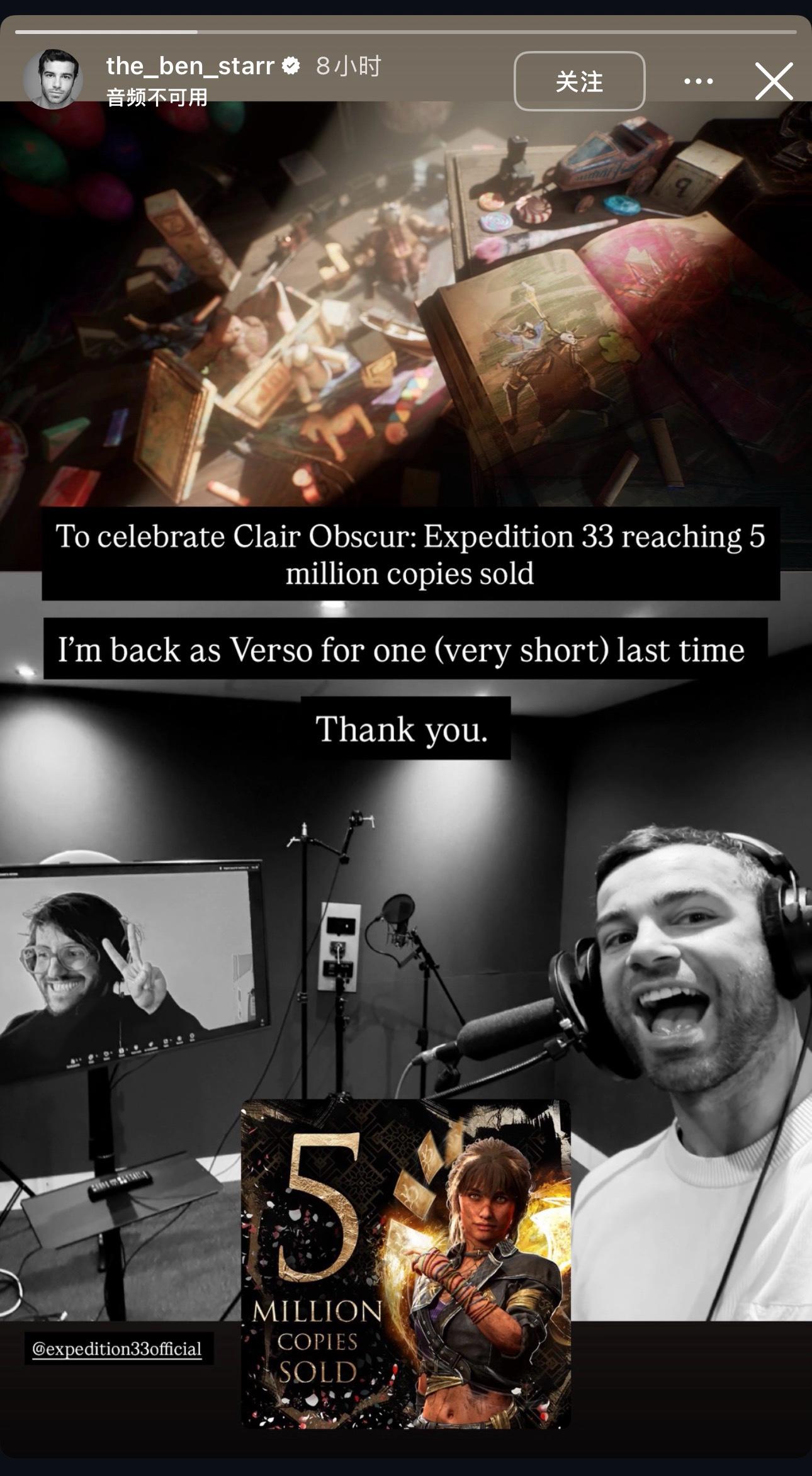 Verso声优Ben Starr在ins上庆祝《光与影33号远征队》突破500万销量大关并表示已经在配音室工作,最后一次短暂地回归Verso角色,33号远征队的下一次更新内容大概率聚焦在Verso上