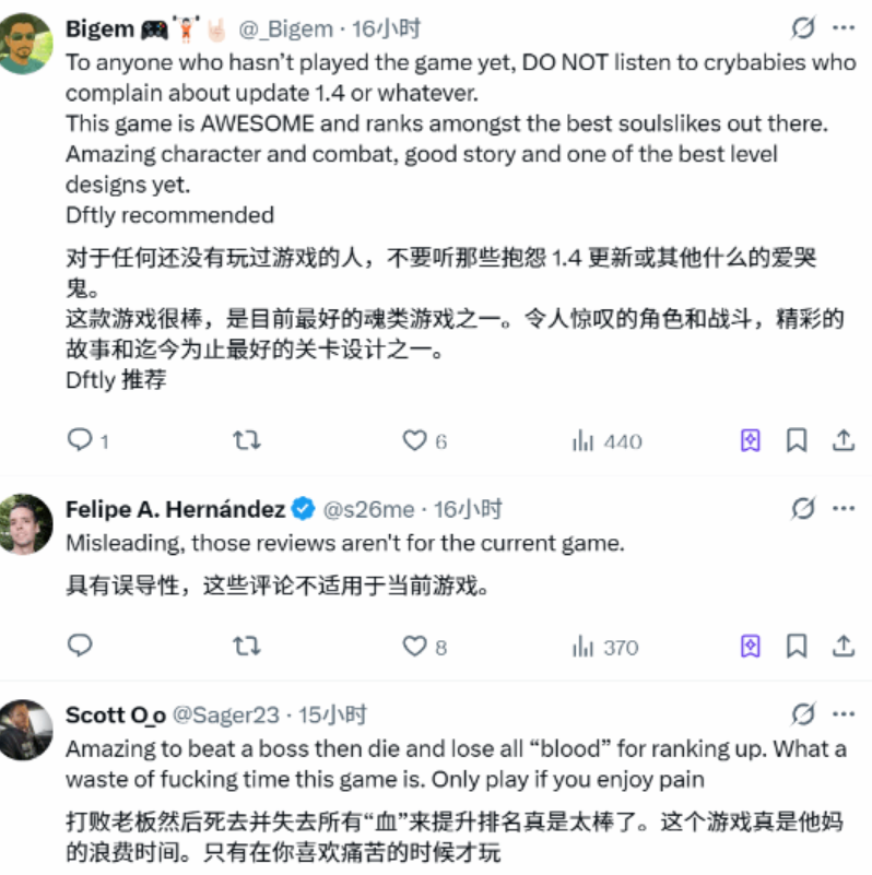 有玩家表示:“不要听那些抱怨更新的人,这款游戏非常棒,堪称顶级魂类之一。”
