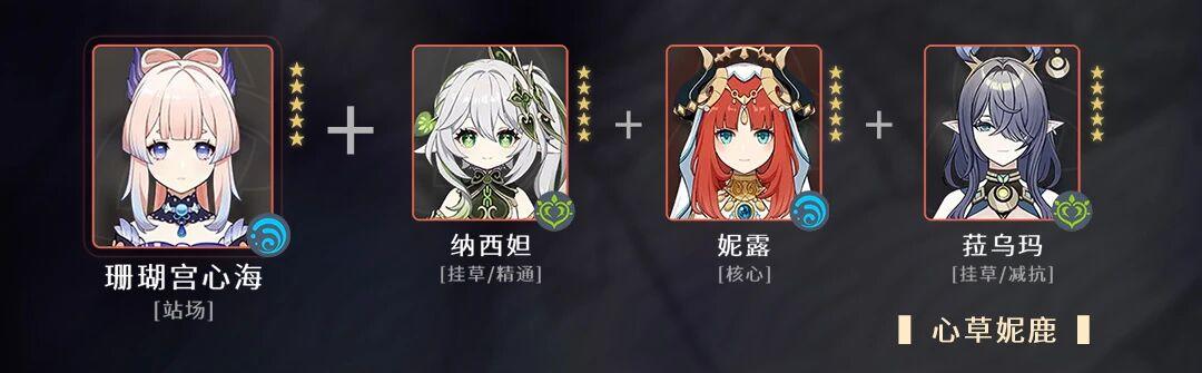 6.1心草妮鹿推荐理由基尼奇前台主C配合行秋触发绽放反应,菈乌玛带草套可以为基尼奇提供55%的减少草抗,通过托马触发种子的烈绽放为基尼奇提供夜魂值