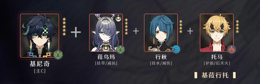 6.2基菈行托推荐理由心海站场挂水配合后台的双草触发月绽放反应,菈乌玛可以提升绽放反应 伤害并且能够减少敌人水草抗性,草神能提升前台精通,妮露作为妮绽放核心可以提升种子的伤害