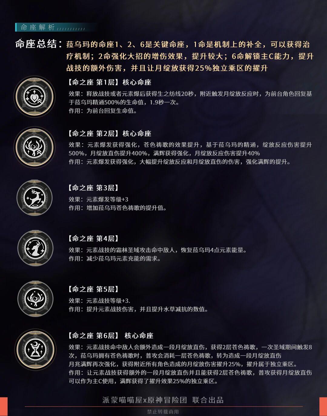 命座 1命1、释放元素战技或元素爆发后一段时间内获得基于精通的持续治疗效果2、重击体力消耗减少,持续时间延长2命1、元素爆发获得的苍色祷歌获得强化,绽放反应和月绽放反应造成的伤害基于菈乌玛的精通获得提升3命提升元素爆发的增益倍率4命元素战技命中时将恢复元素能量5命提升元素战技的倍率6命1、元素战技命中敌人将基于元素精通造成一次月绽放伤害,并获得两层苍色祷歌2、在拥有苍色祷歌是,菈乌玛的普攻造成额外的月绽放反应伤害3、月绽放反应伤害获得独立乘区的擢升