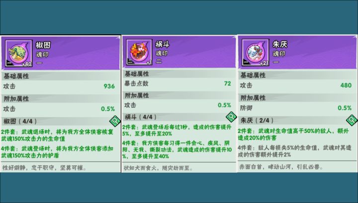 魂印的选择和搭配看似复杂实则简单,只要明确一点就可以(见图二)基础属性和附加属性都是加成给侠客的,侠客的最高攻击提高了,进而提高了武魂的继承攻击,椒图,祸斗,朱厌的套装属性是直接加成给武魂的。这个游戏是以攻击为主的,值得保留的魂印就3种,只要是