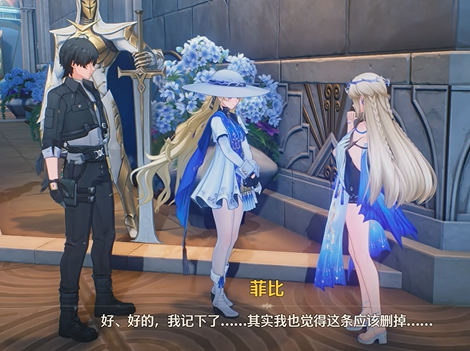 之后在拉古那能碰见修会组菲比和小卡在讨论关于教条戒律的事,卡提希娅表示这教条改的一坨必须全砍掉,然后小菲比趁机说“其实我觉得这条也应该删掉”,我还以为菲比要说自己青枝月桂沙拉的事情了,没想到菲比还是软糯糯一只,只是稍微夹带私货让小卡把公职人员禁止接触公共声骸的戒律删掉了,虽然看不到两小只因为青枝月桂沙拉扯头发,不过想到之后菲比就可以无限贴贴毛茸茸了也是非常美味的场景呢~