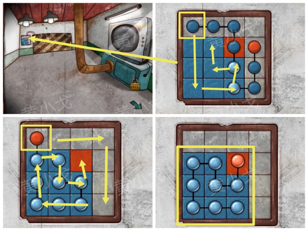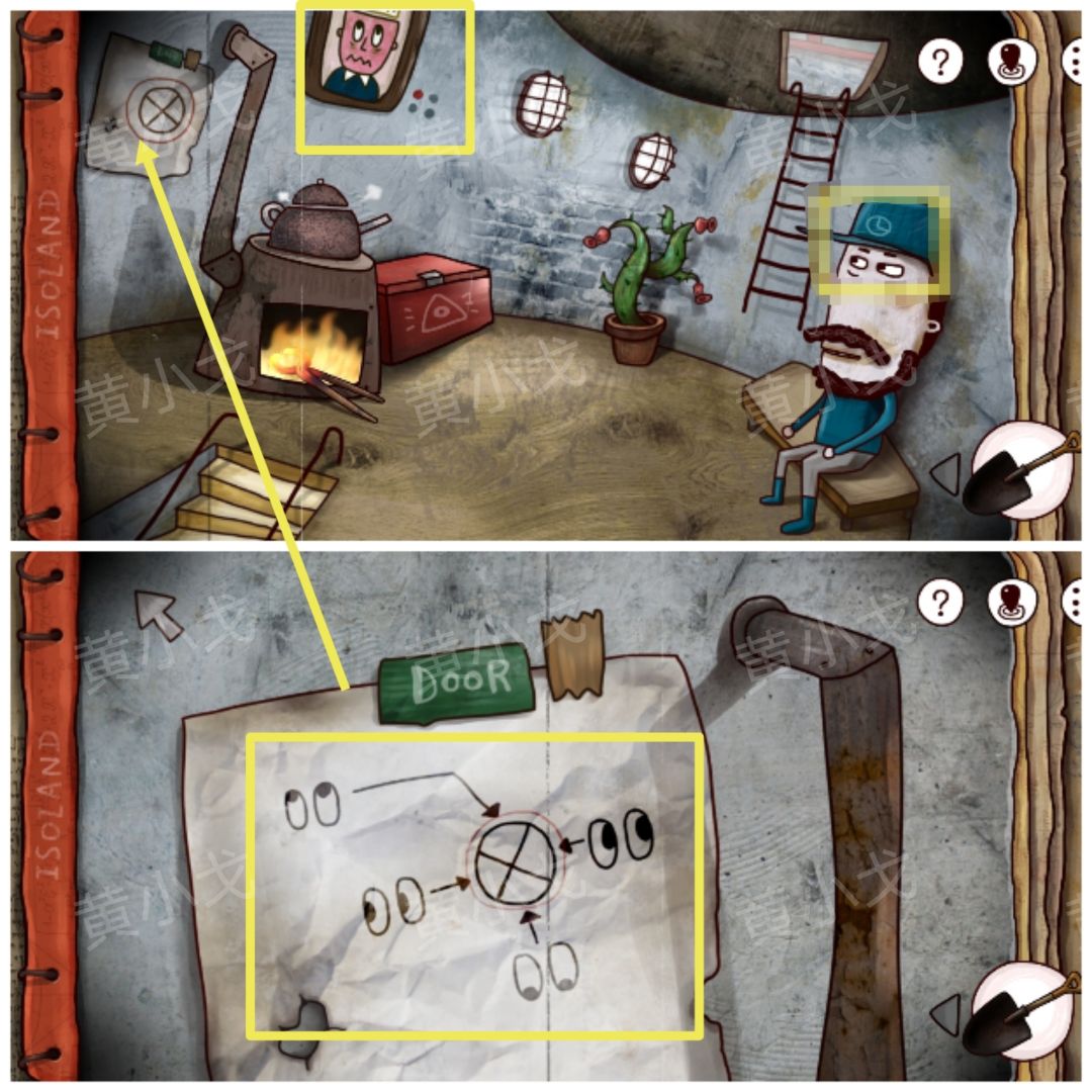1.剧情引导后。查看铁盒里的信件;盖上铁盒,注意地图上的红点坐标和木板上的方位