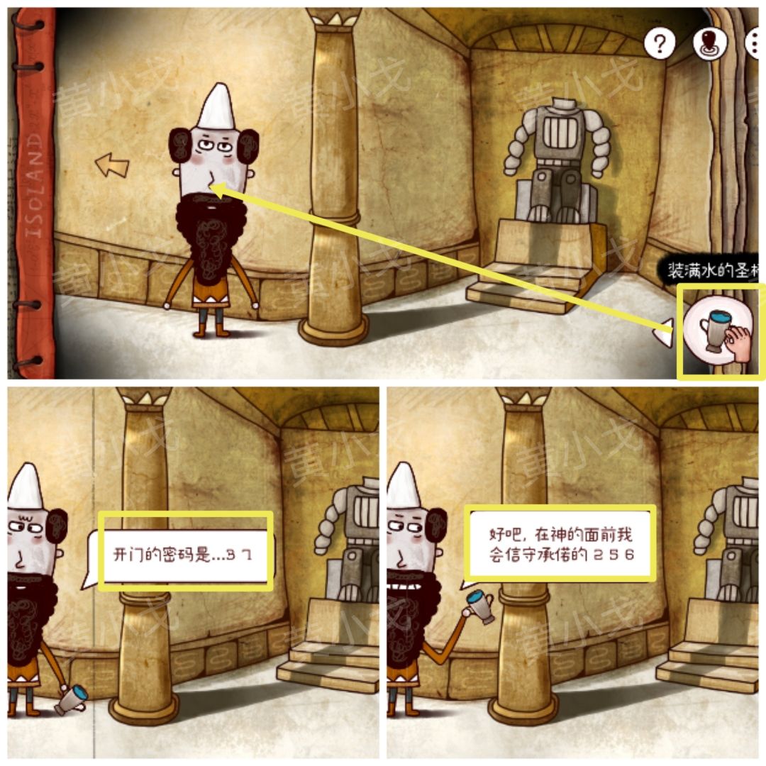 19.用【装满水的铁桶】灭火炉里的火,获得【铁钳】;与阿比对话,获得神庙开门密码