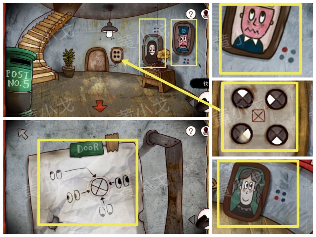 7.点击门旁边的密码锁,根据[灯塔-二楼]纸上的线索,结合[灯塔-顶层]、[灯塔-二楼]和[灯塔-一楼]画像上的人物的眼珠朝向及旁边的红点位置,调整密码锁上白色扇形的位置,打开灯塔的后门