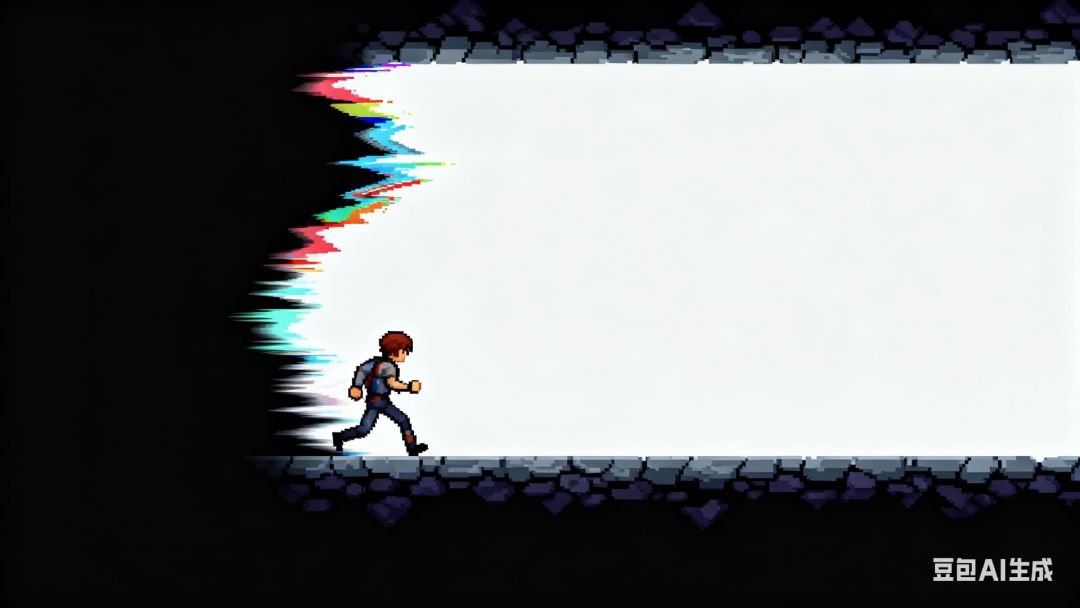 如果玩家向左边移动,会遇到一处特别的区域,游戏速度会放慢,音乐也会拉长音。但是再向右移动就会瞬移回原点,一切正常。