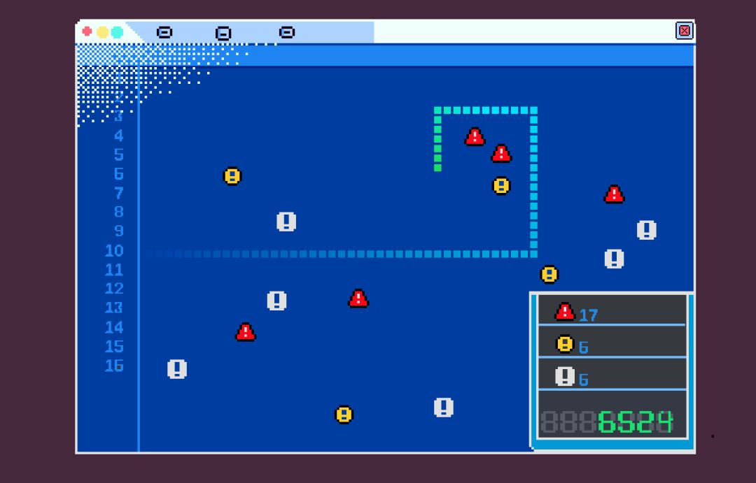 划线圈地,玩家引导一条线(代码链)去包围(圈地)场景里的bug(会移动的目标),圈地的过程中bug碰到线(代码链)会使其失效并断裂成新的bug,成功圈住则会消除bug