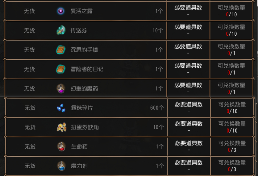 怕怕粉可以交换60露珠,100扭蛋券碎片(刚好合成一张),3生命药,3魔力剂,10复活露珠,100传送券,沉思的手镜,冒险者日记,幻重魔药 然后为了凑到买幻重的数量还买了个魔素箱