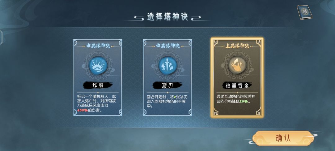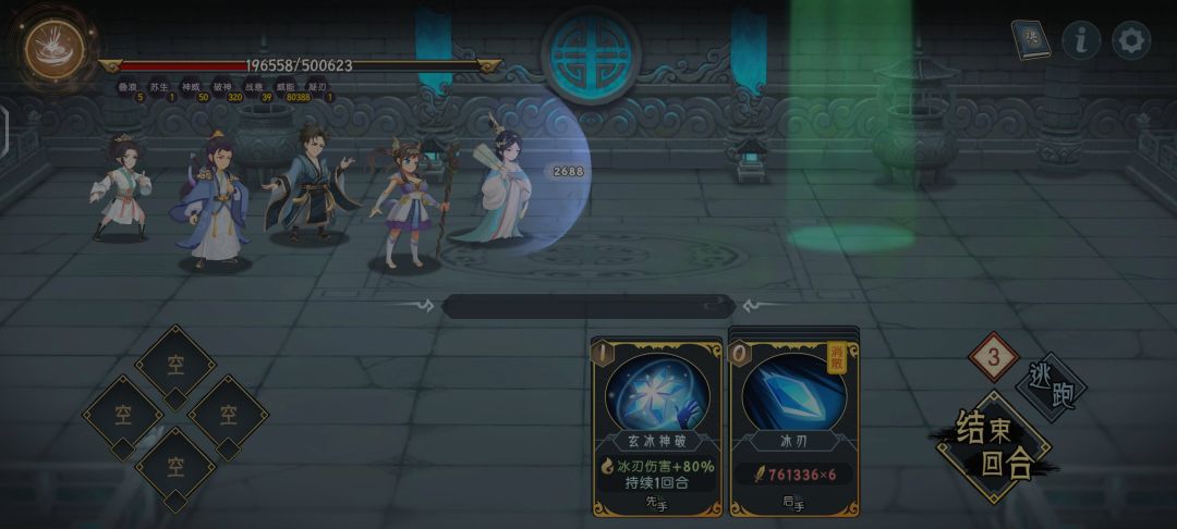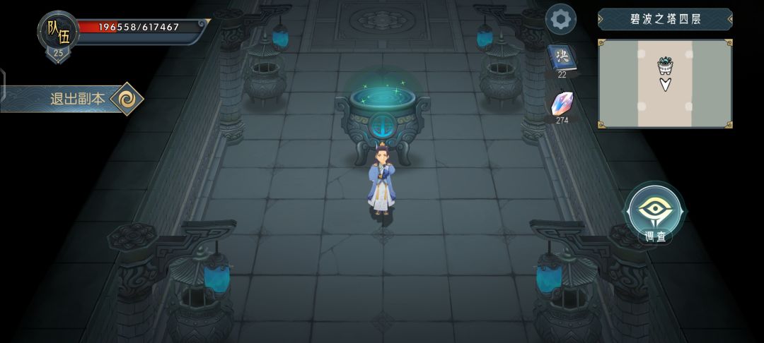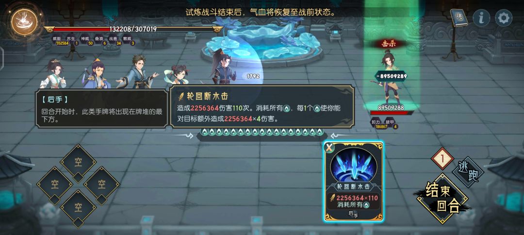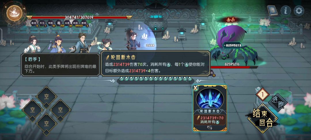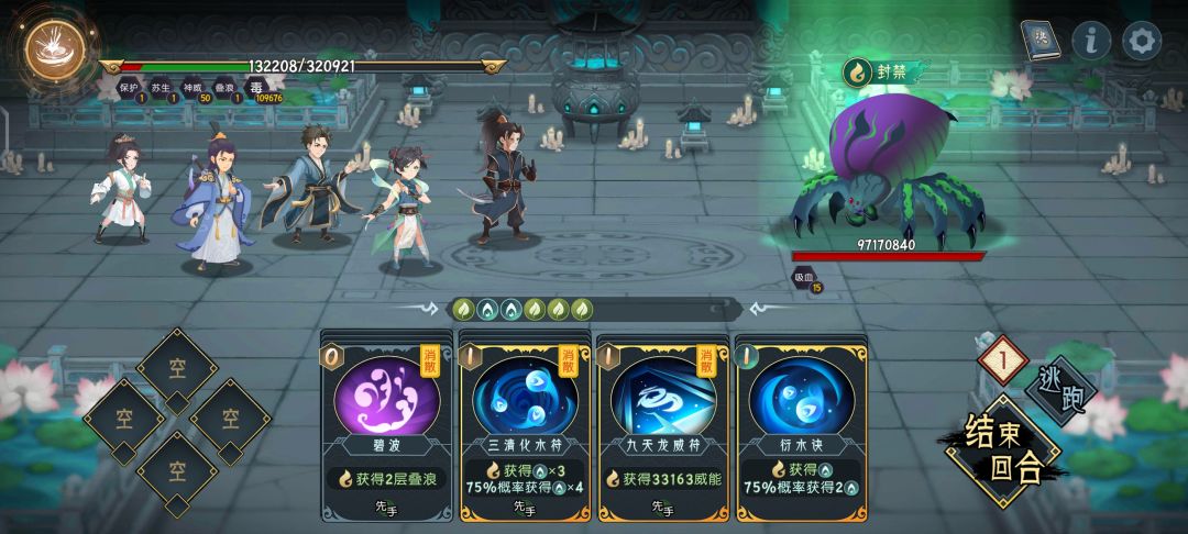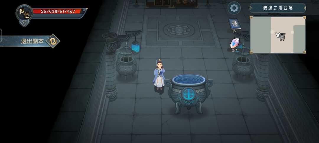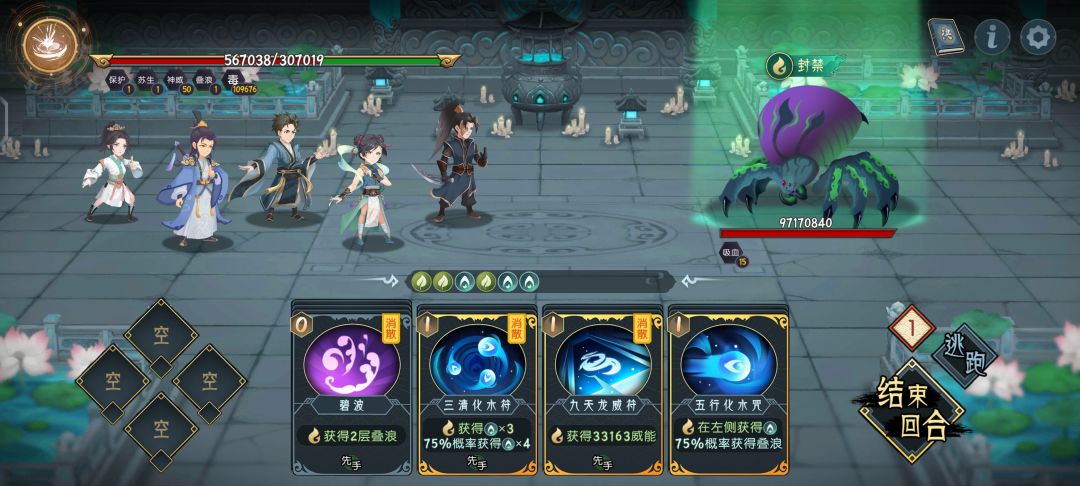 请不要选大树,因为大树会影响轮回断水的快感,打是能打,解毒葫芦2个,先天宝甲抗第一下真实伤害,然后屯冰刃3-5回合,就可以秒秒秒了。队伍带唐婉+燕彩环+柳盈,主角带个留神破衣服。有人说会灵气不够,凹一下水韵塔神诀生效就完事。好了大树那边基本毕业,只要小怪不赌路#长生天机降世 水塔15:四层