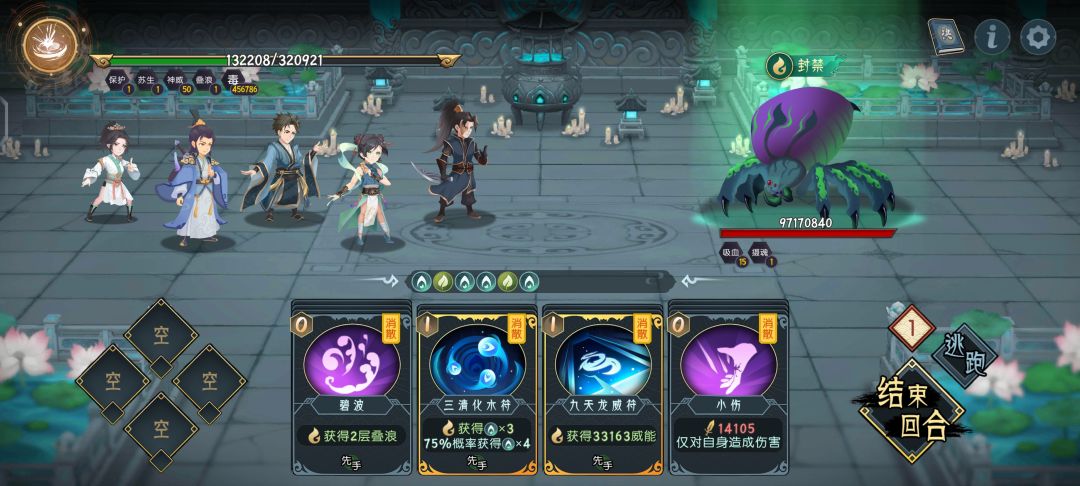 四层:选左边蜘蛛,右边不选,三尾会复活不好打,进去逛一圈可以看到就是蜘蛛赌路,不带解毒葫芦是40多万毒,带了四个解毒葫芦就是10万多,蛤蟆冰刃存2回合就可以秒过去,其他的随便打打。然后换血量装队伍,吃60%血量,不好意思我又50万血量了,打完我们还剩下30万血量,还有复活甲上五楼,还有金蓝绝杀。