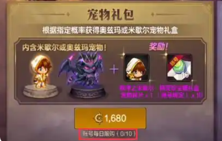 两款礼盒定价均为1680点券,但价值差异明显。宠物礼盒包含玛特伽宠物碎片,集齐10个碎片可合成1只玛特伽宠物,相当于“购买10套赠1套”的隐性福利;